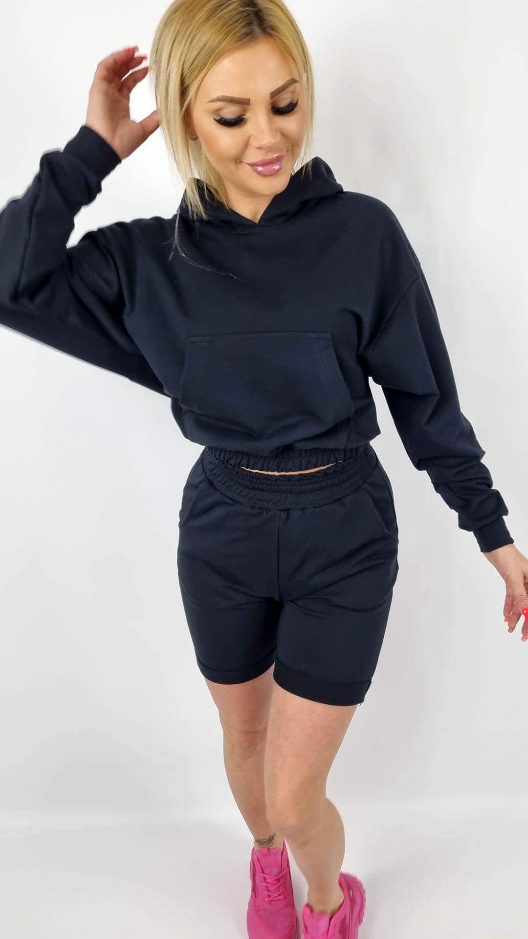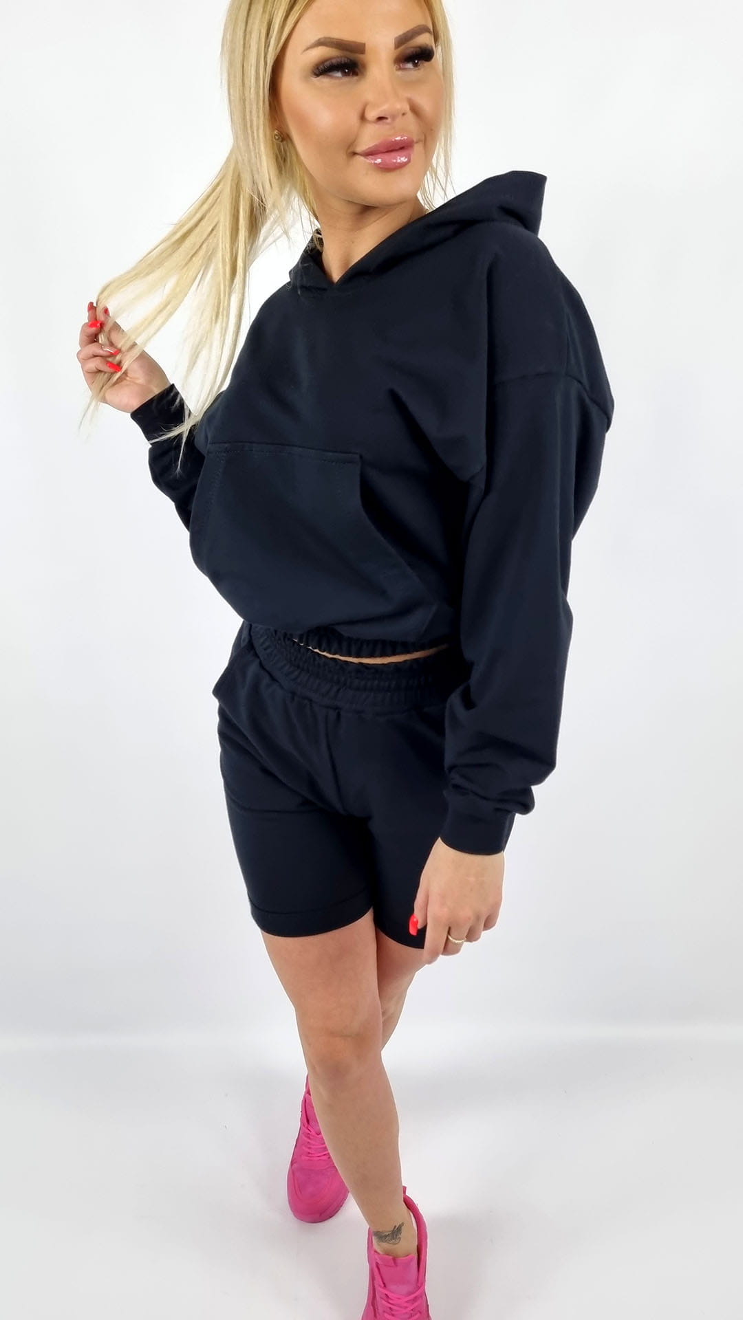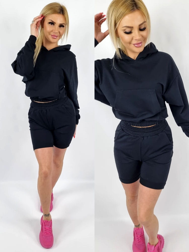 Uszyty z wysokogatunkowej dresówki. Dzianina jest mięciutka i elastyczna. Szeroka bluza z kapturem wkładana przez głowę. Rękawy oraz dół bluzy zakończone ściągaczem. Na przodzie posiada kieszonkę. Stylowe i mega wygodne spodenki. Posiadają wyższy stan. Pas w spodenkach jest marszczony. Po bokach posiadają kieszenie. Dobrej jakości materiał sprawi, że będziesz czuć się w nim komfortowo i swobodnie. Komplety dresowe to must have w tym sezonie.