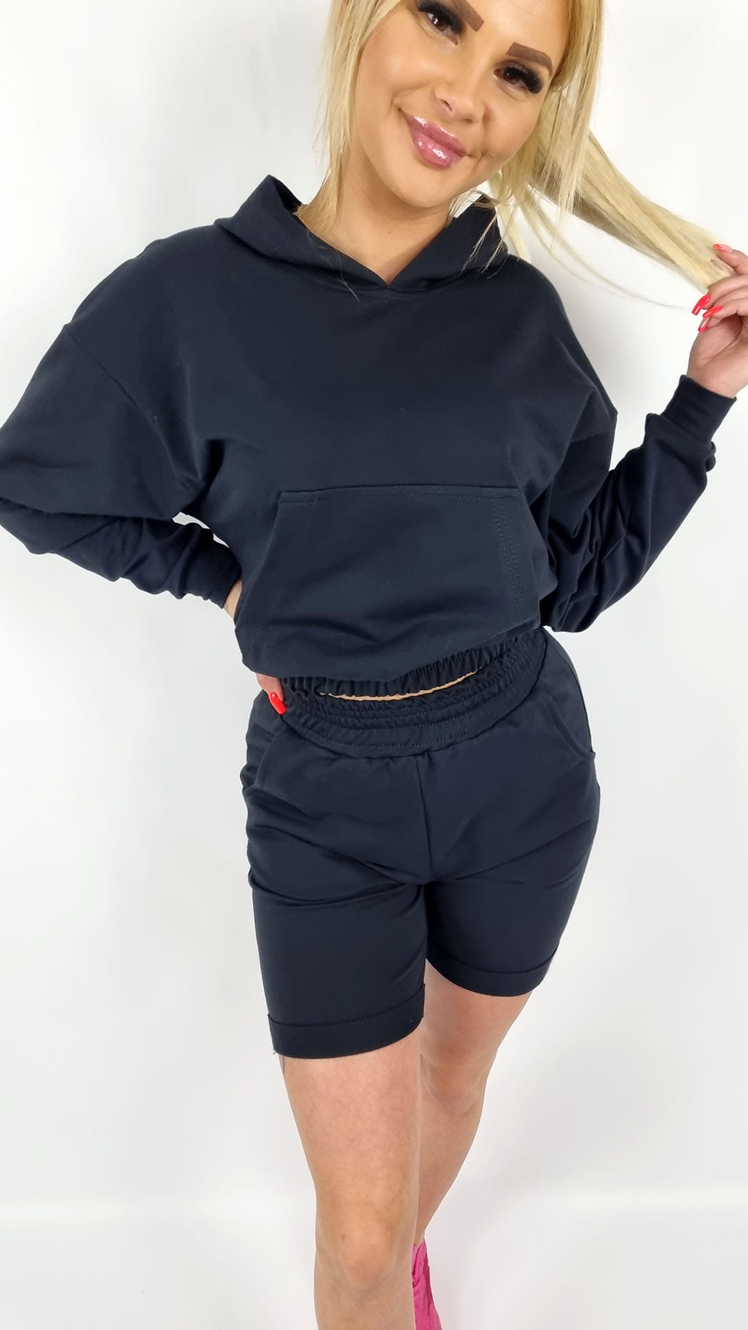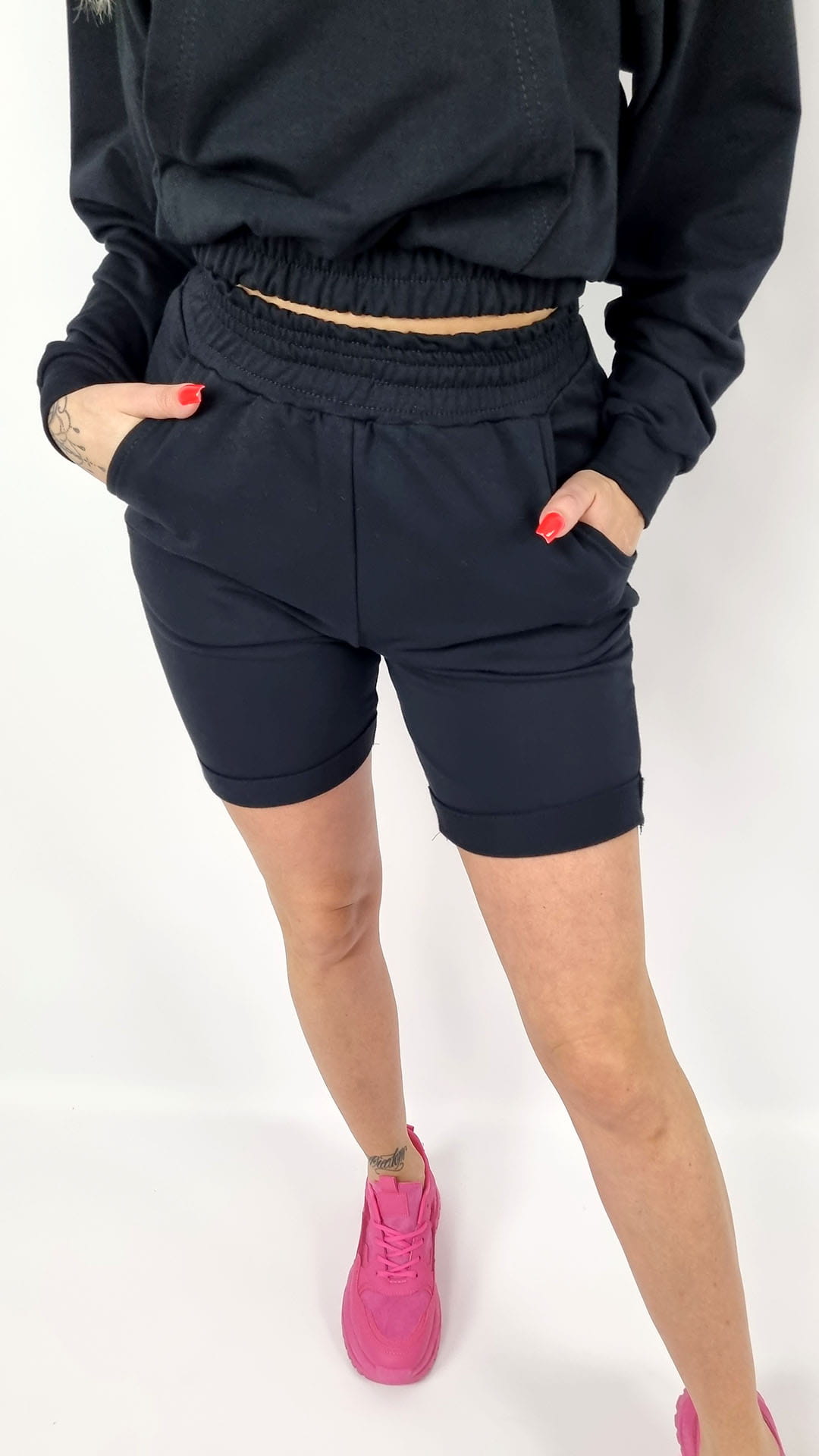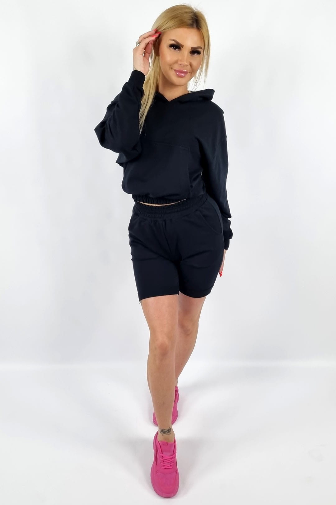 Uszyty z wysokogatunkowej dresówki. Dzianina jest mięciutka i elastyczna. Szeroka bluza z kapturem wkładana przez głowę. Rękawy oraz dół bluzy zakończone ściągaczem. Na przodzie posiada kieszonkę. Stylowe i mega wygodne spodenki. Posiadają wyższy stan. Pas w spodenkach jest marszczony. Po bokach posiadają kieszenie. Dobrej jakości materiał sprawi, że będziesz czuć się w nim komfortowo i swobodnie. Komplety dresowe to must have w tym sezonie.
