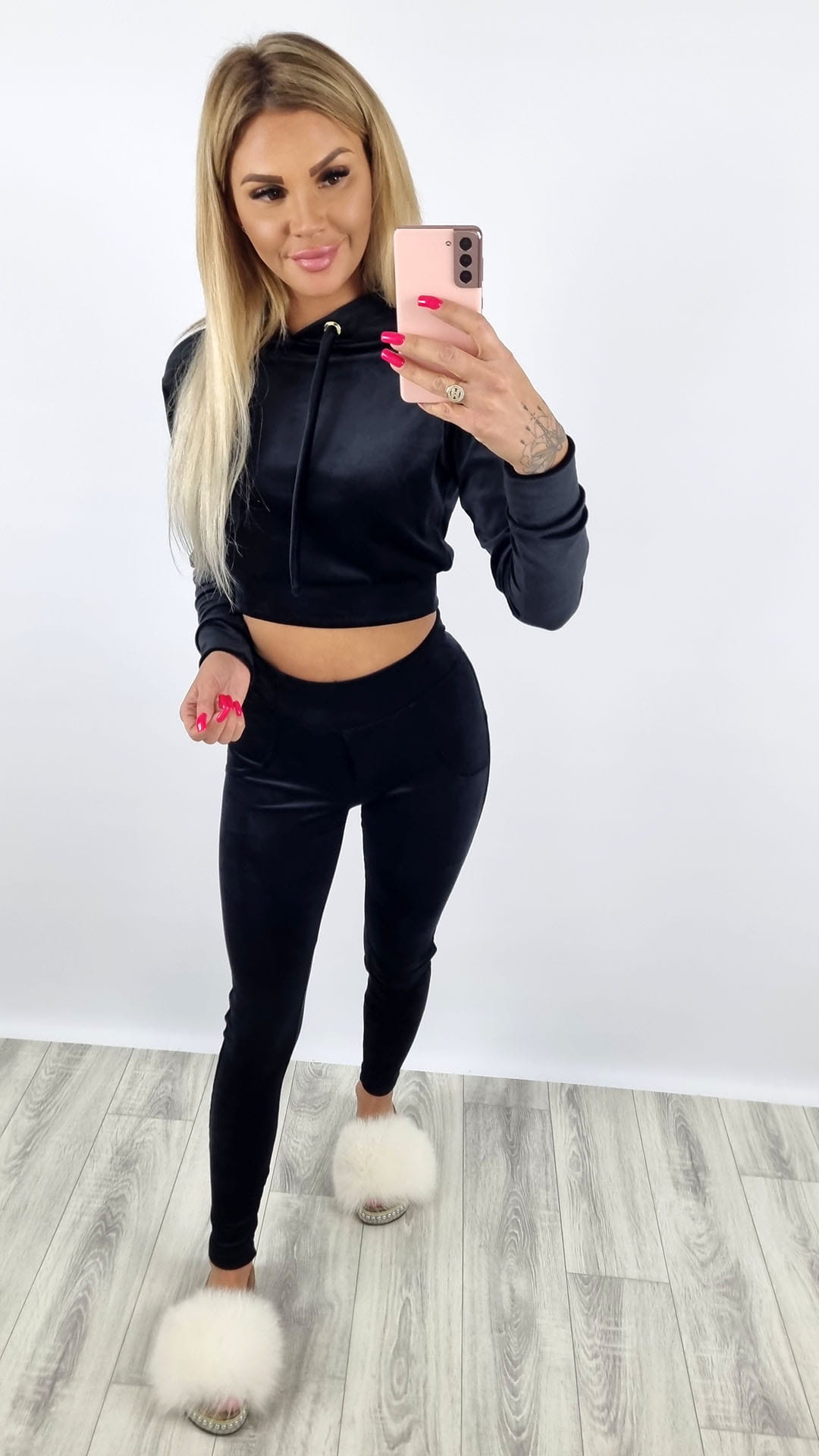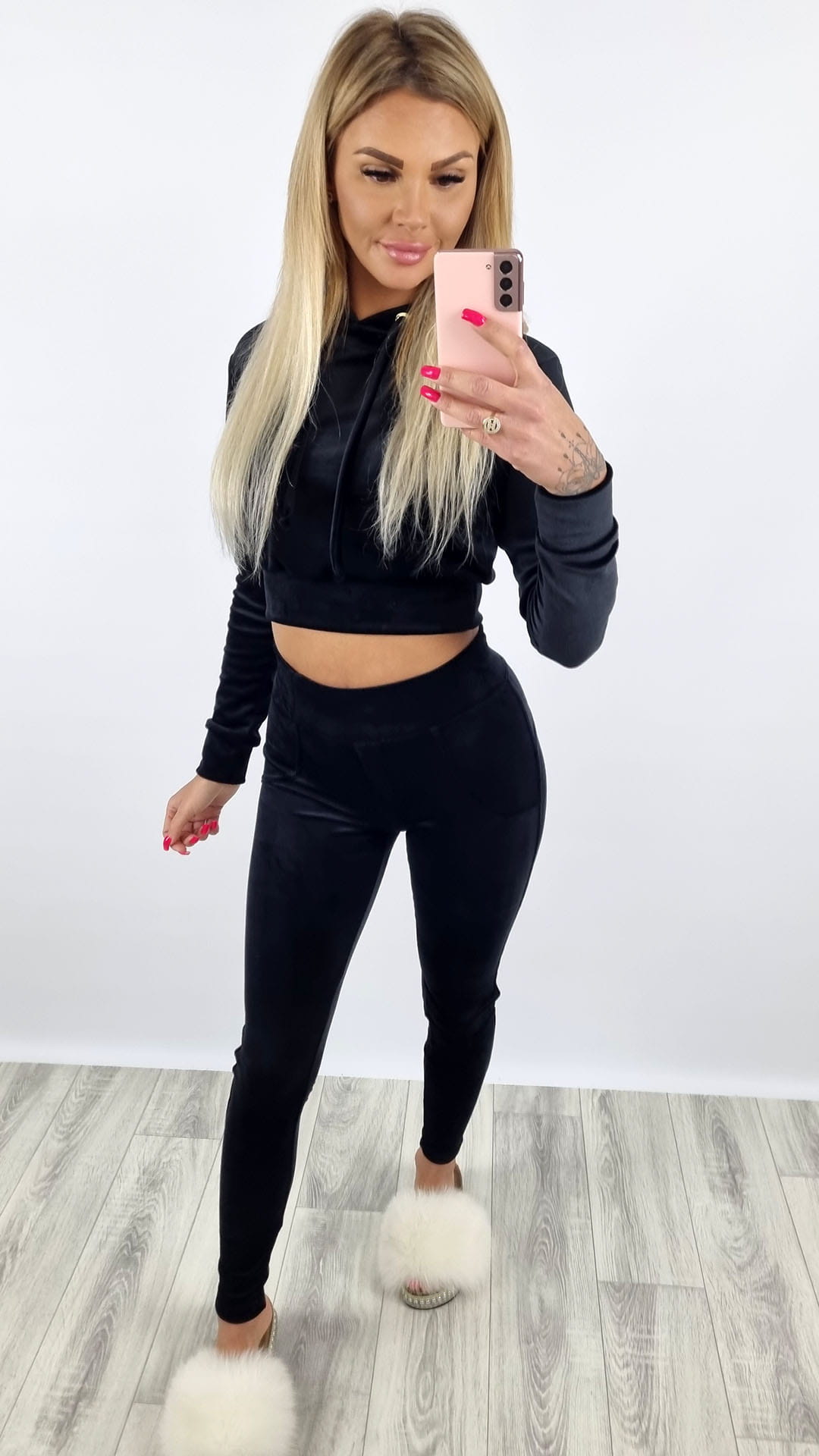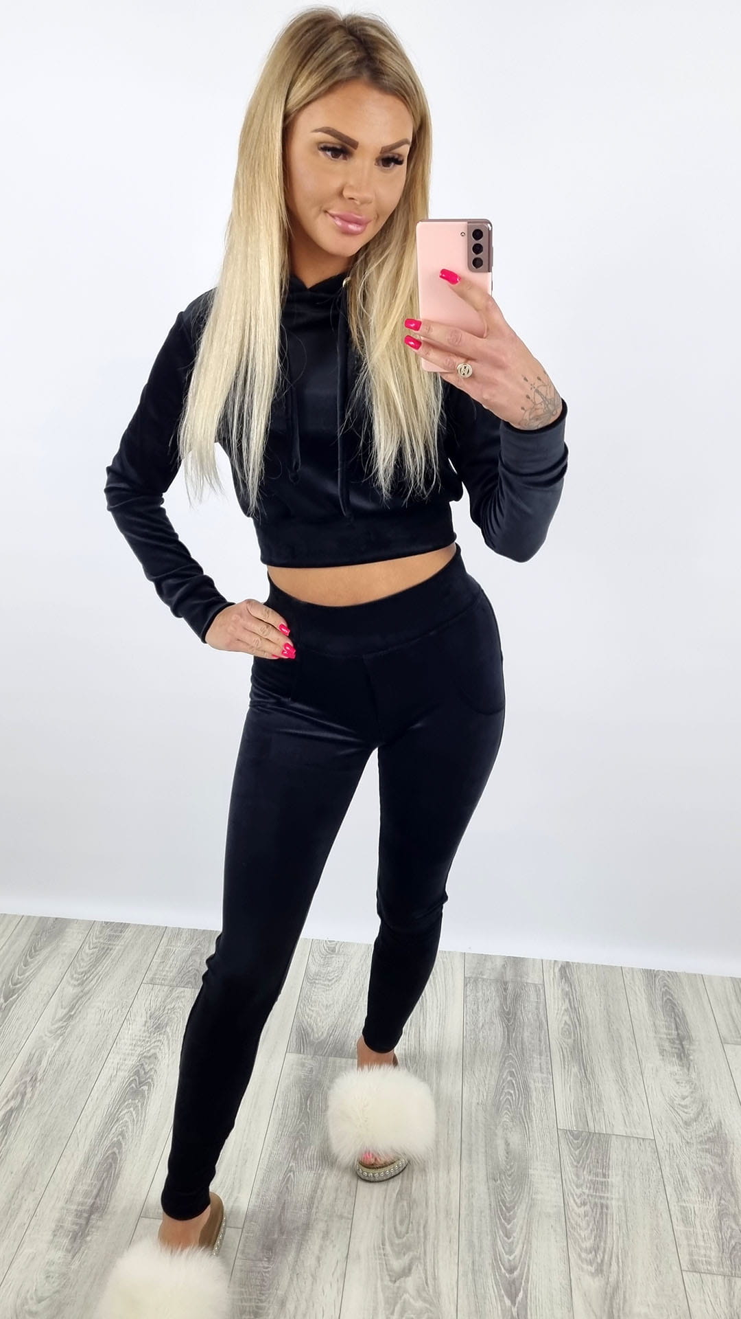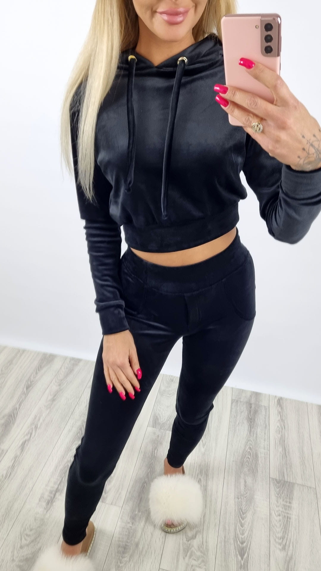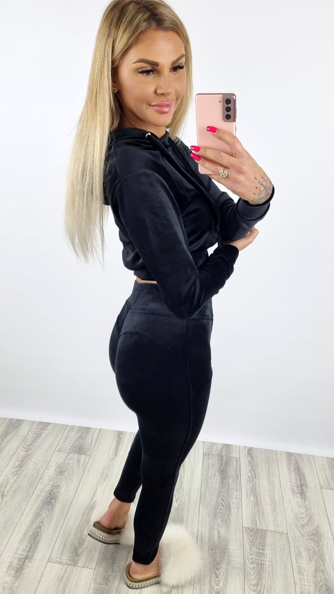 Taki komplet to bardzo fajna opcja na stylizację. Uszyty z wysokogatunkowego weluru. Ten zestaw zawiera krótką bluzę oraz wygodne i dopasowane legginsy. Legginsy posiadają wyższy stan z szeroką gumą w pasie. Są dopasowane i pięknie podkreślają sylwetkę. Góra kompletu to bluza z kapturem o krótkim fasonie. Rękawy oraz dół bluzy zakończone są ściągaczem. Nasz komplecik to wyjątkowy styl i niepowtarzalny look. Totalny sztos!