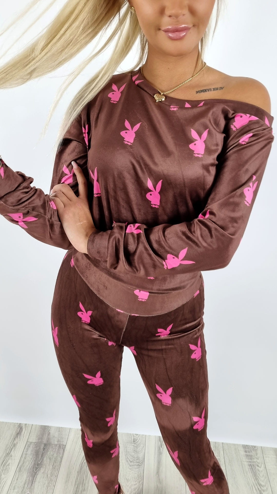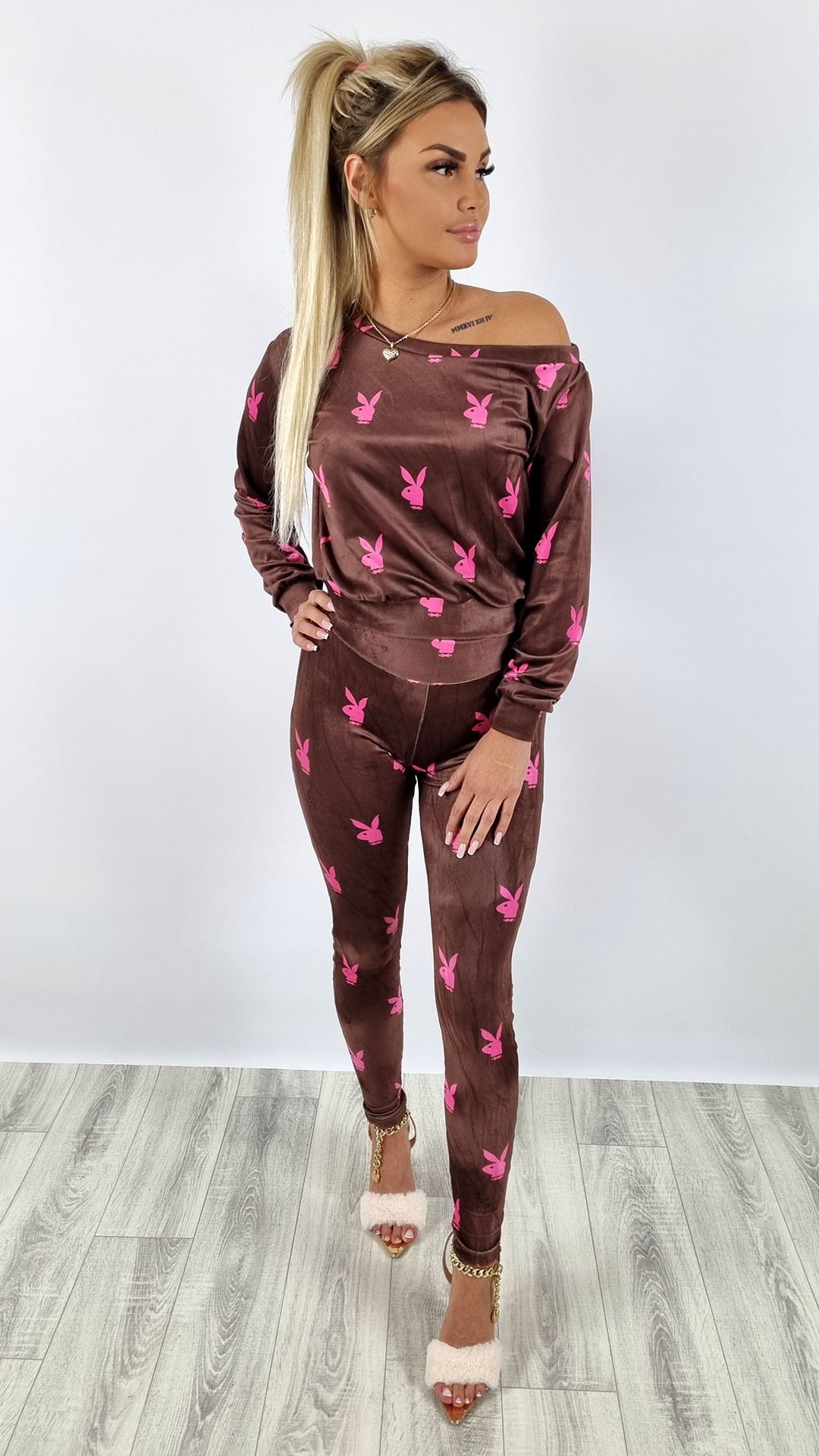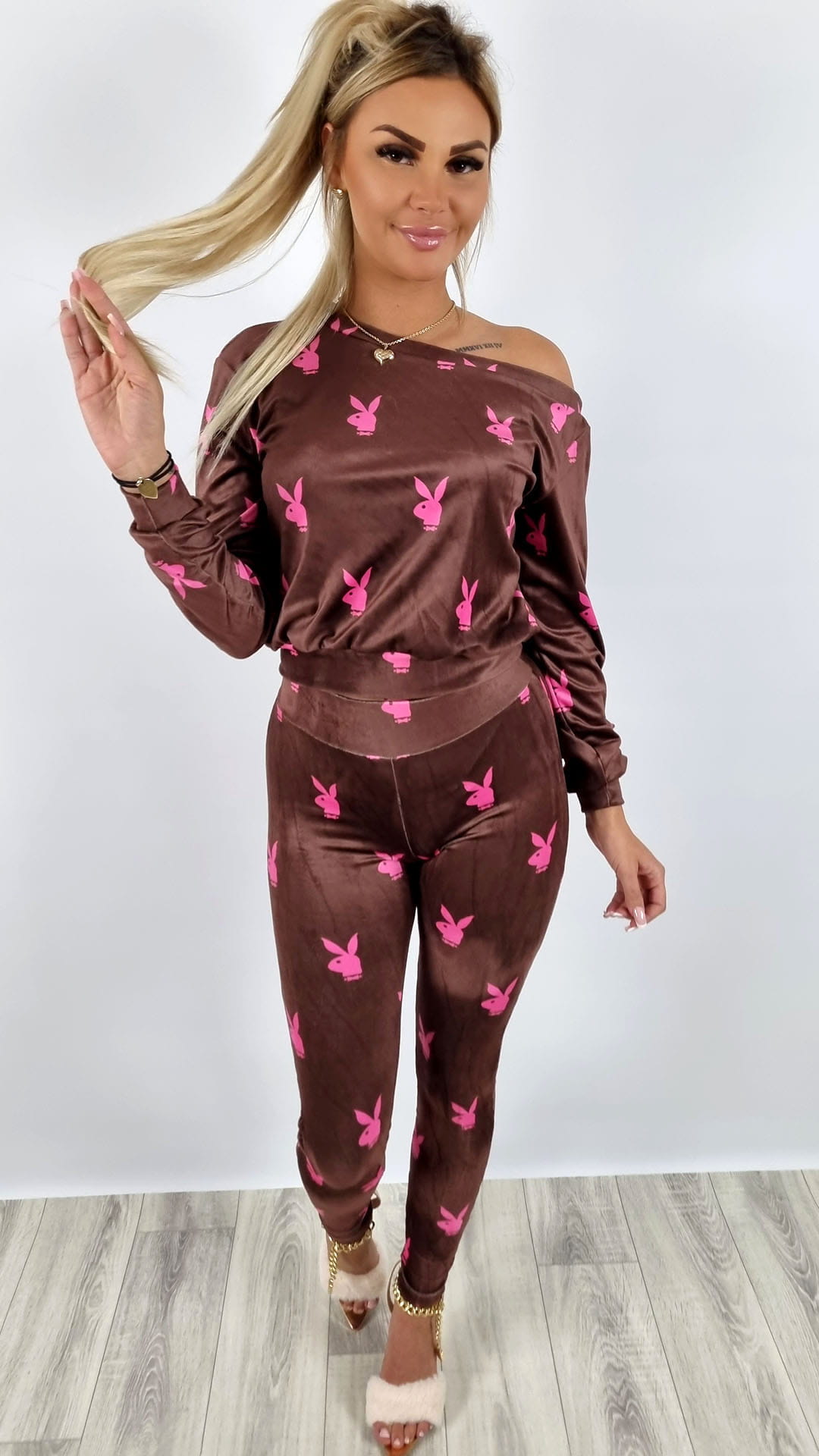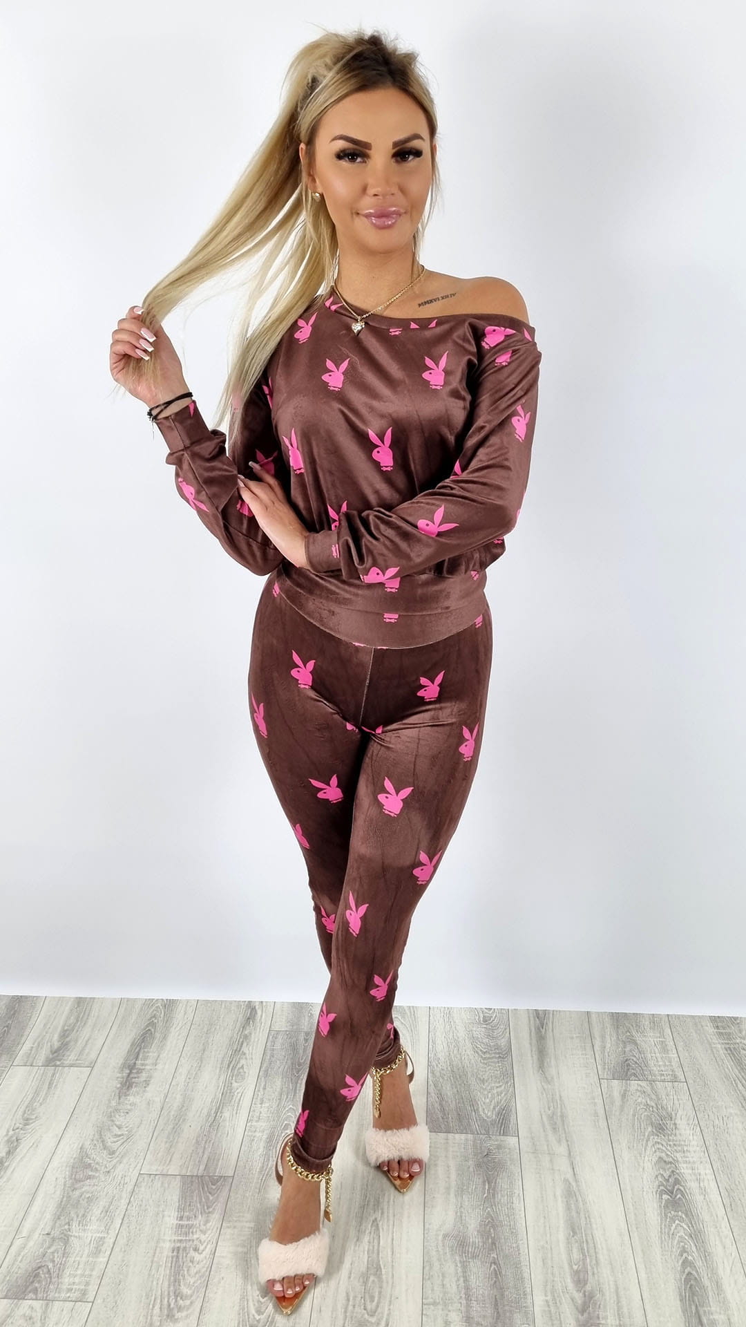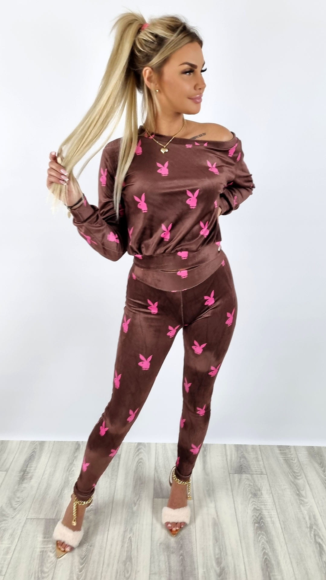 Komplet welurowy bluza + legginsy króliczki brązowy K142