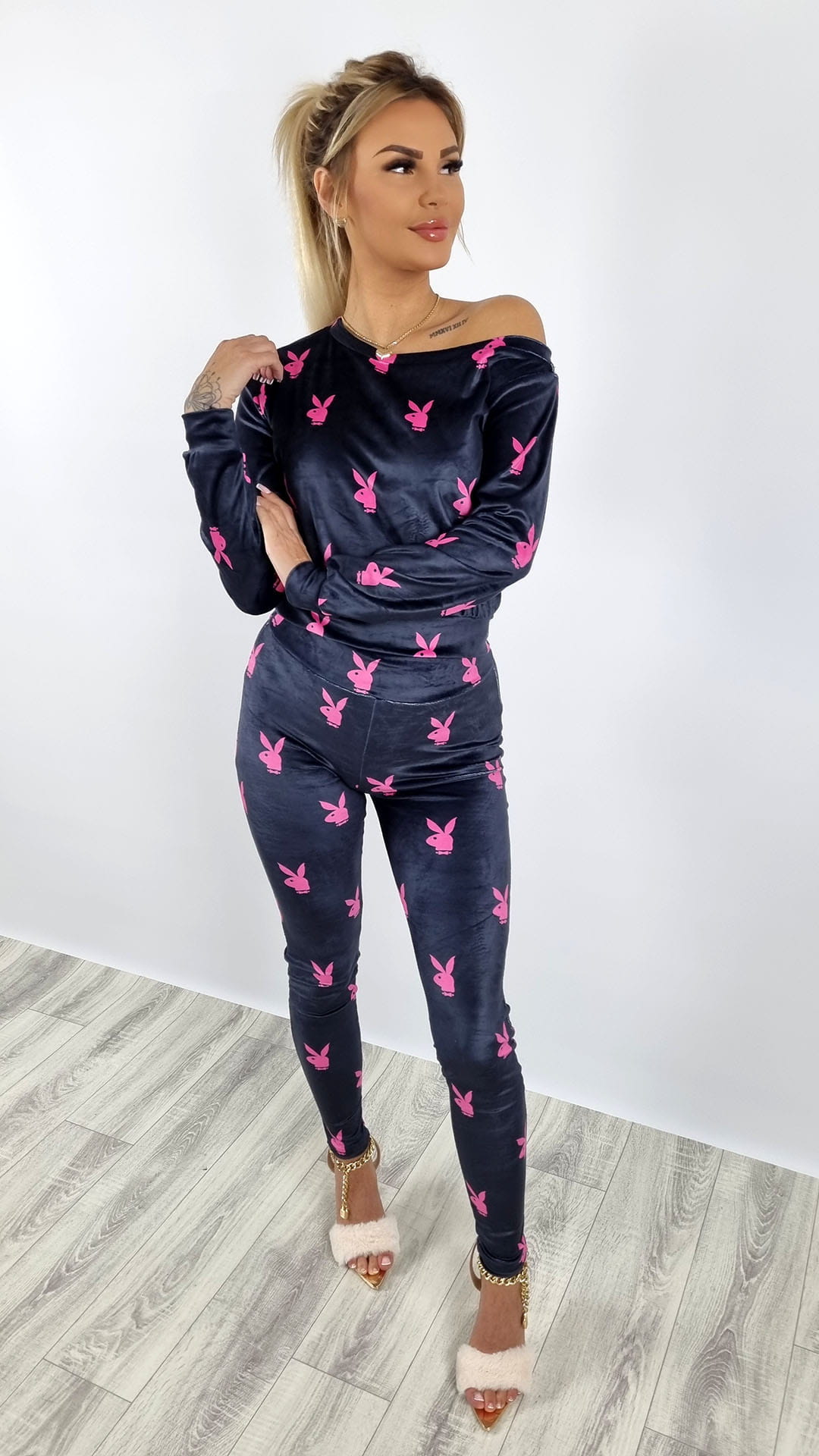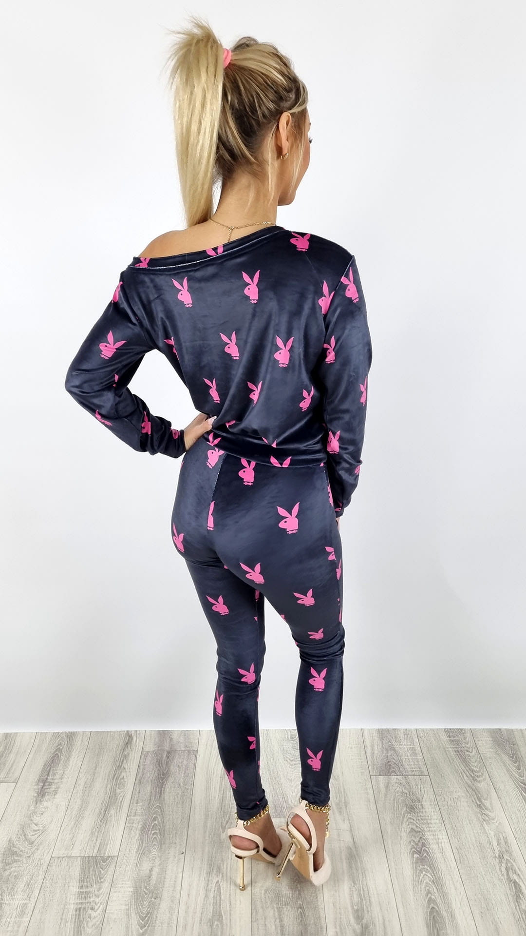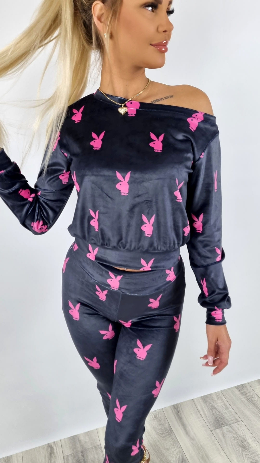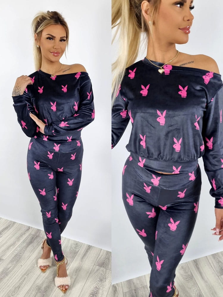 Komplet welurowy bluza + legginsy króliczki czarny K142