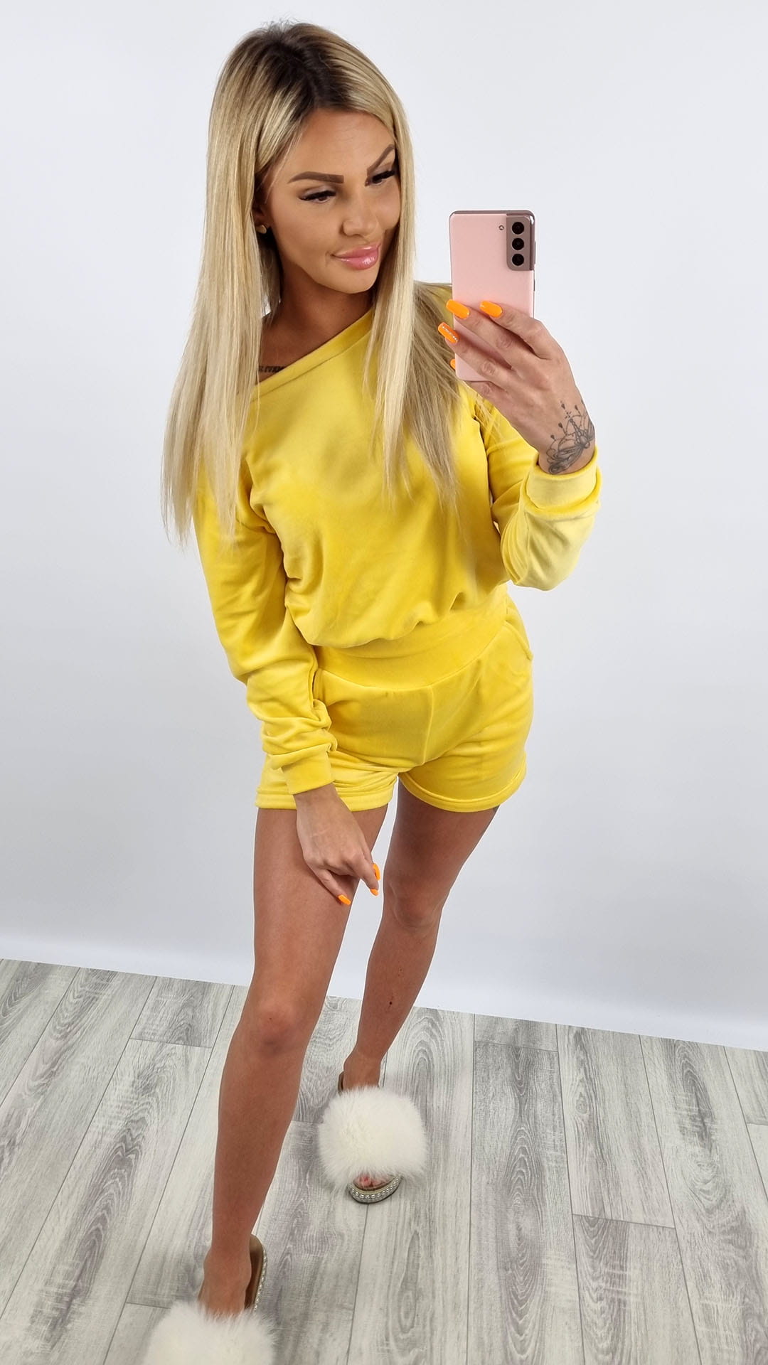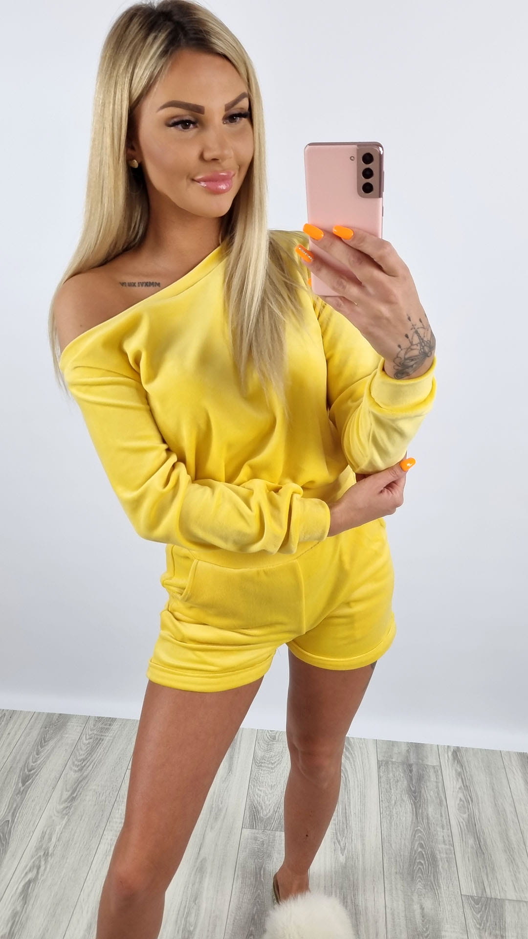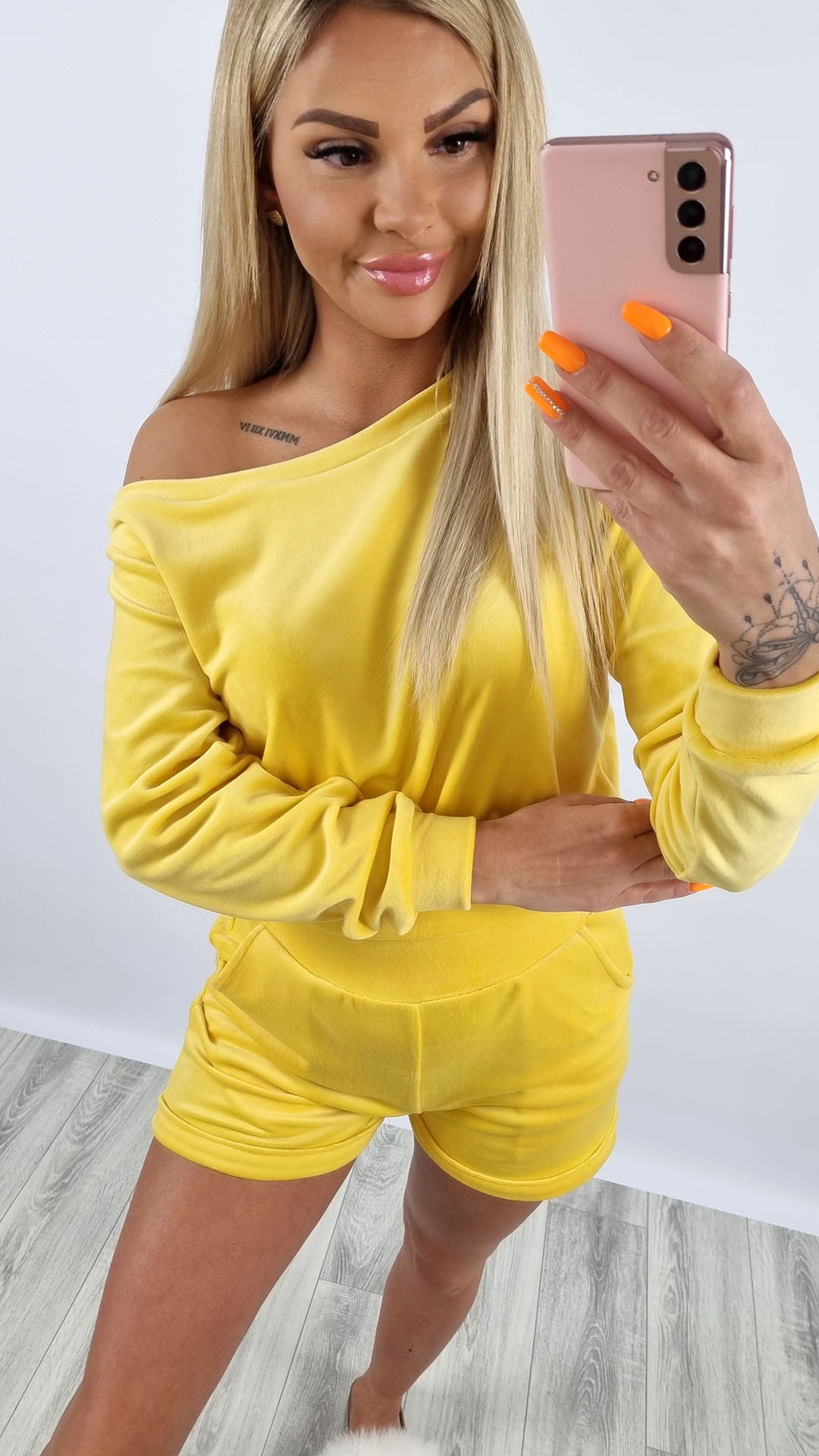 Komplet welurowy bluza na ramię + spodenki żółty K108