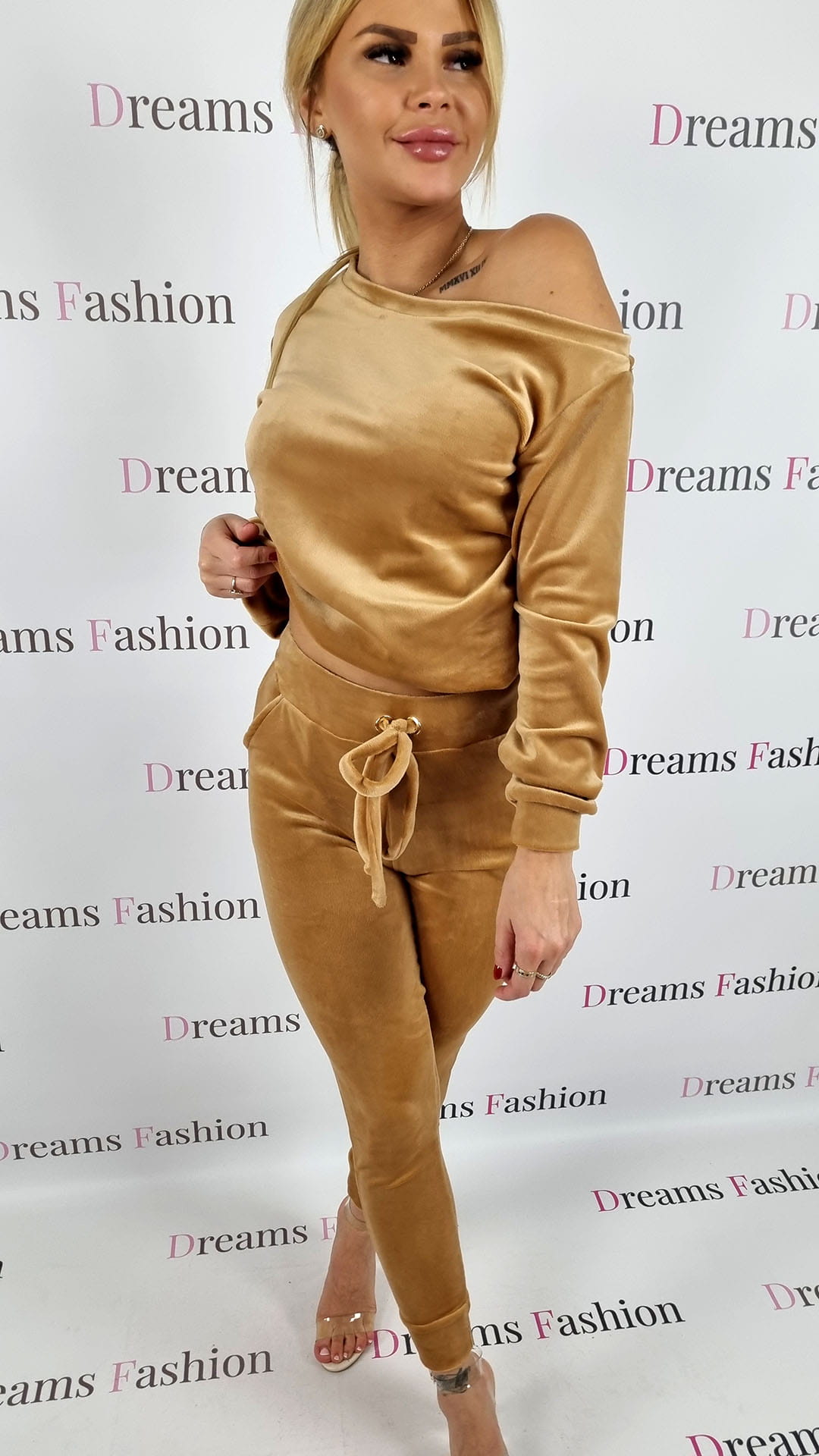 Komplet welurowy bluza na ramię + spodnie karmel K09