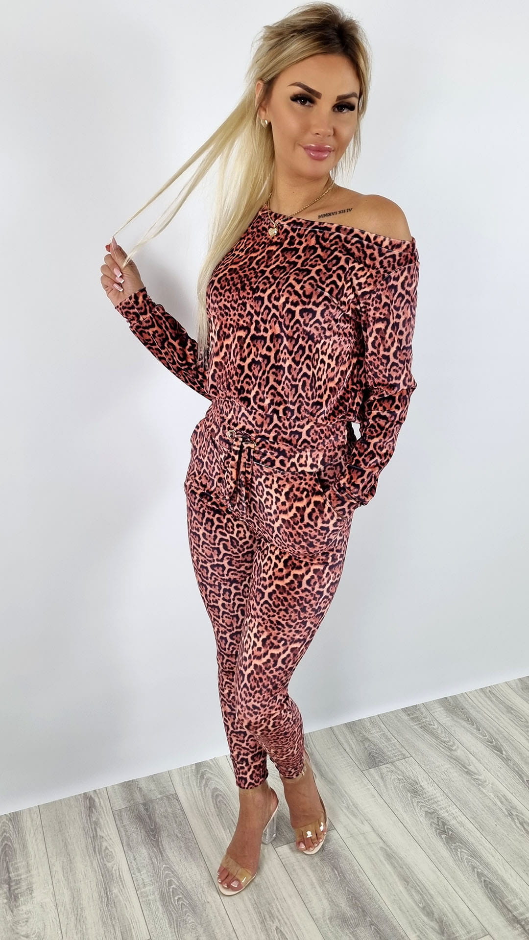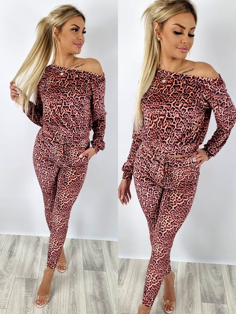 Komplet welurowy bluza na ramię + spodnie panterka K129