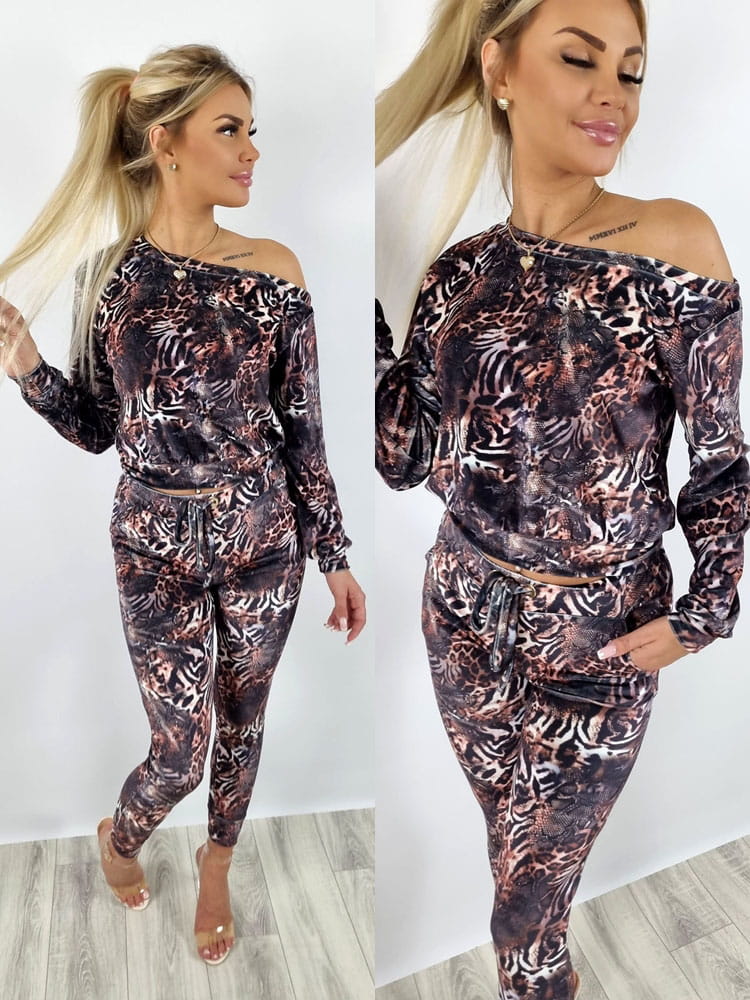 W naszym komplecie będziesz czuć się idealnie! Uszyty z mięciutkiego elastycznego weluru. Materiał jest bardzo przyjemny w dotyku. Ten zestaw zawiera bluzę na ramię oraz spodnie. Luźniejsza bluza opadająca na jedno ramię co dodaje szyku. Rękawy oraz dół bluzy zakończone są ściągaczem. Stylowe i mega wygodne spodnie. Spodnie posiadają w pasie gumę i wiązane są sznureczkiem. Po bokach posiadają kieszenie. Nogawki zakończone ściągaczami. W tym komplecie wybijesz się z tłumu i przyciągniesz wiele spojrzeń. Model ten znajdziecie w różnych pięknych wzorach.