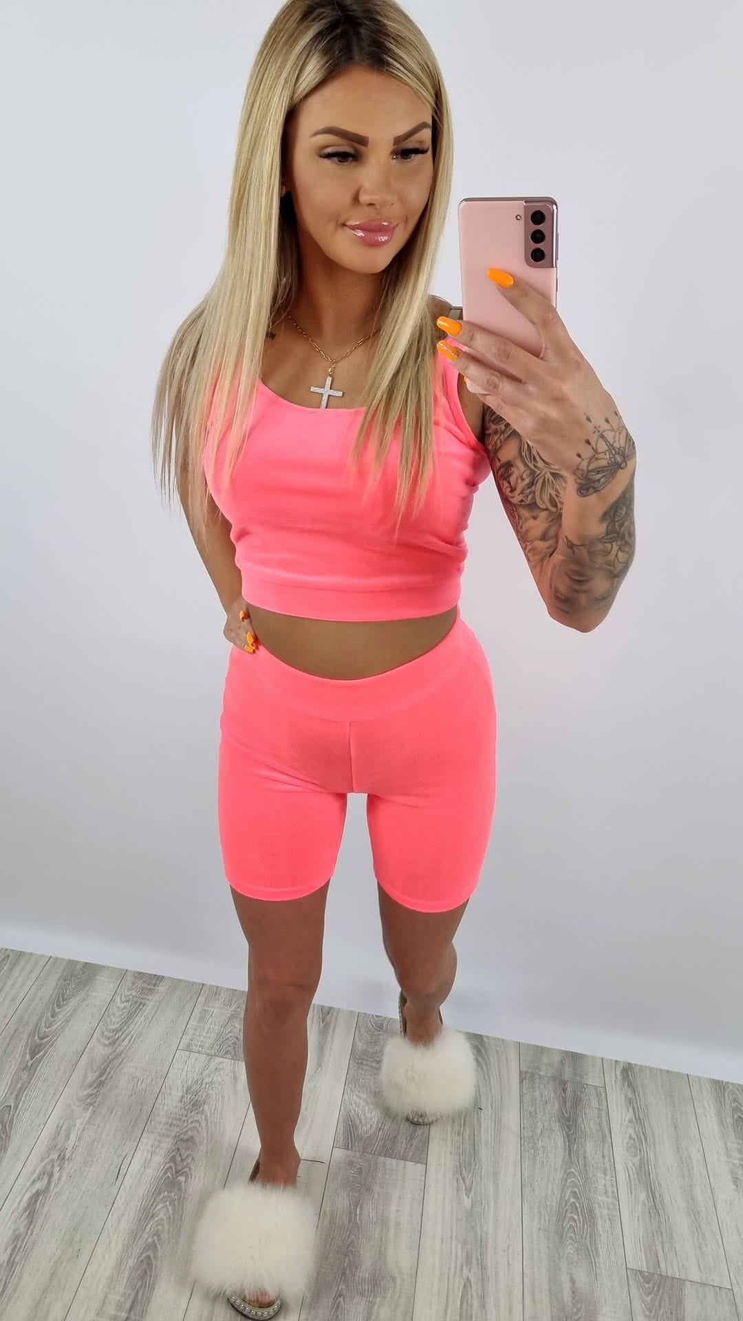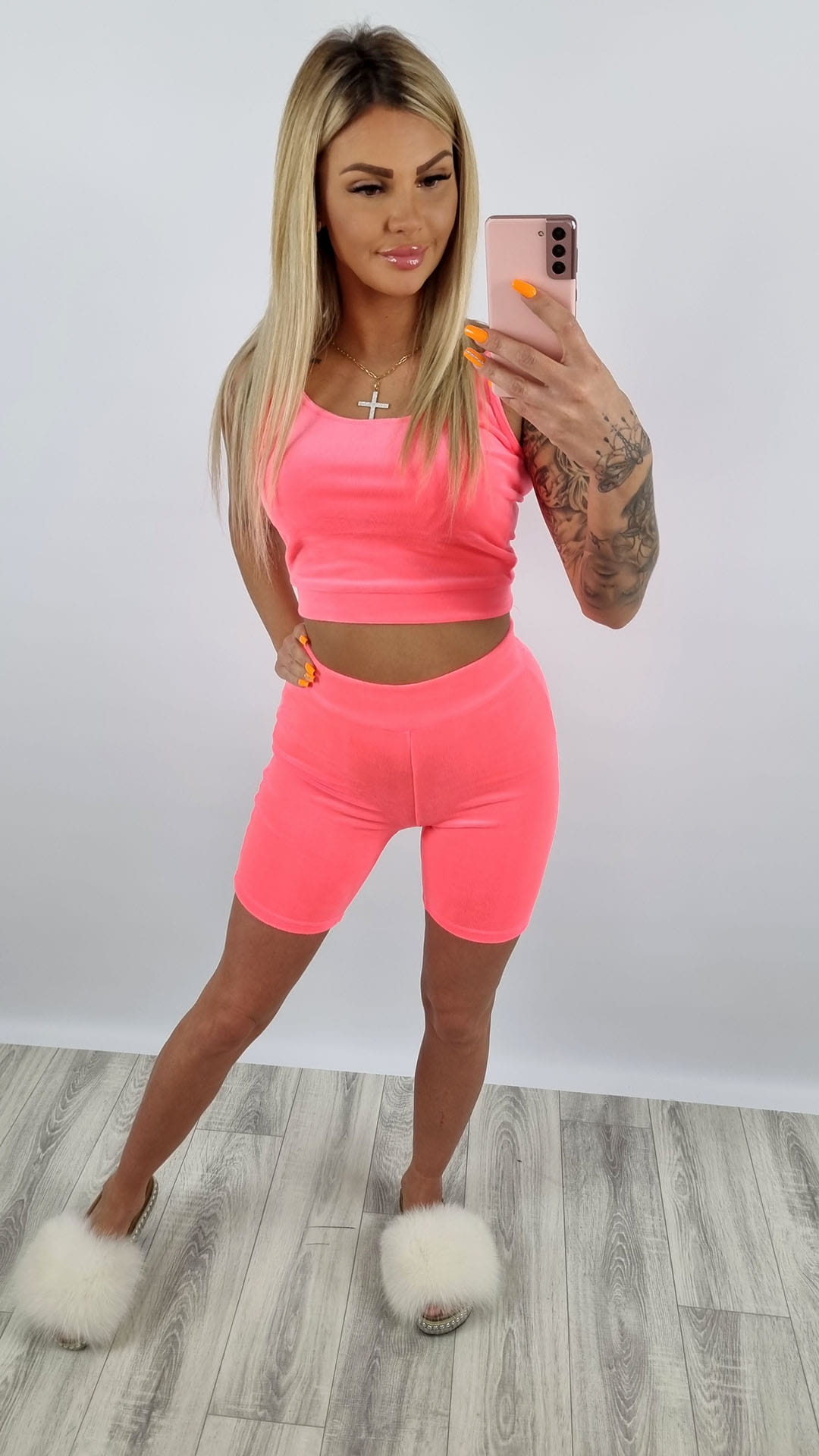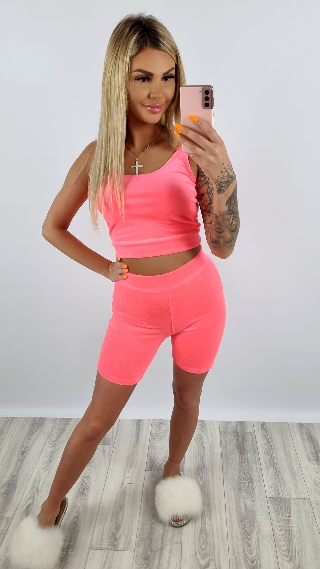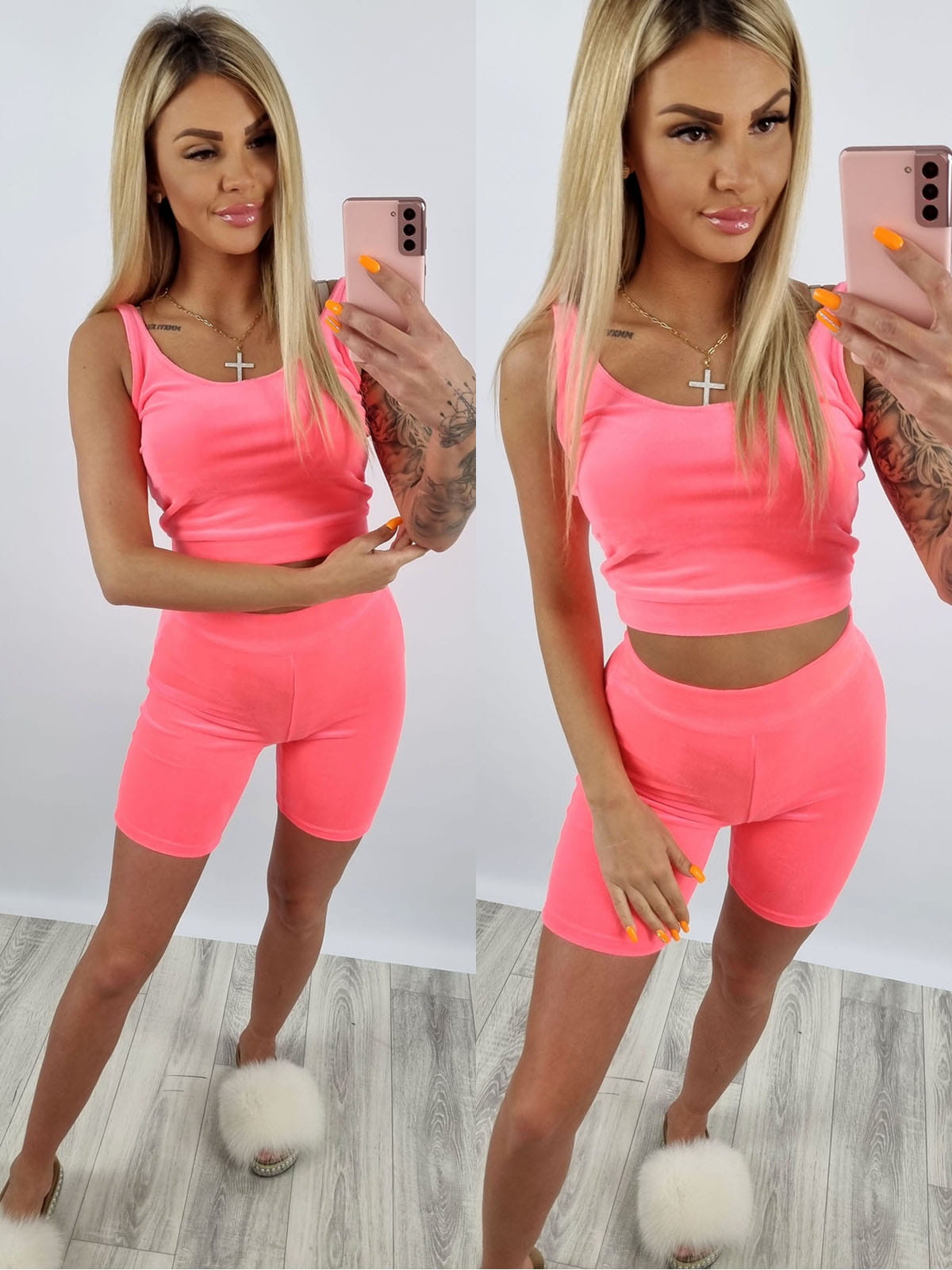 Komplet dwuczęściowy który zagościł w naszych nowościach to propozycja dla kobiet, które kochają odważny styl. Top który pięknie podkreśla figurę, spodenki w stylu kolarek tworzą idealną całość. Welurowy materiał dopasowuje się do ciała, zapewnia komfort noszenia każdego dnia. Ten uroczy komplet jest stworzony dla fanek wygody i codziennego komfortu ruchu.